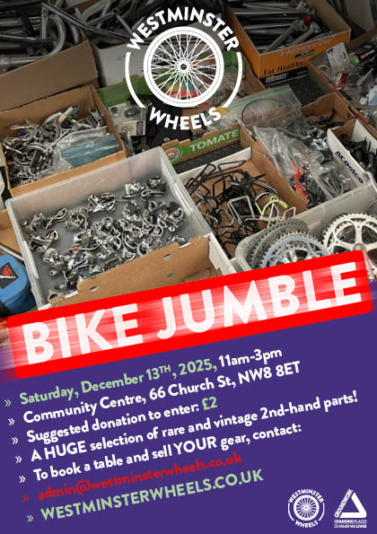 Westminster Wheels has collected some magnificent rare and vintage bike parts over the years and now’s your chance to get hold of some beautiful classic components! OR you can book a table and sell YOUR 2nd-hand equipment in the amazing BIKE JUMBLE!!